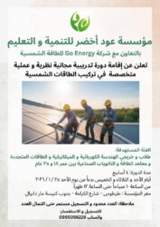 فرصة تدريبية مجانيةللشباب يلي حابين ينمو معرفتهم بأنظمة الطاقة الشمسية و يقدرو يبلشو شغل بعد إنتهاء التدريب